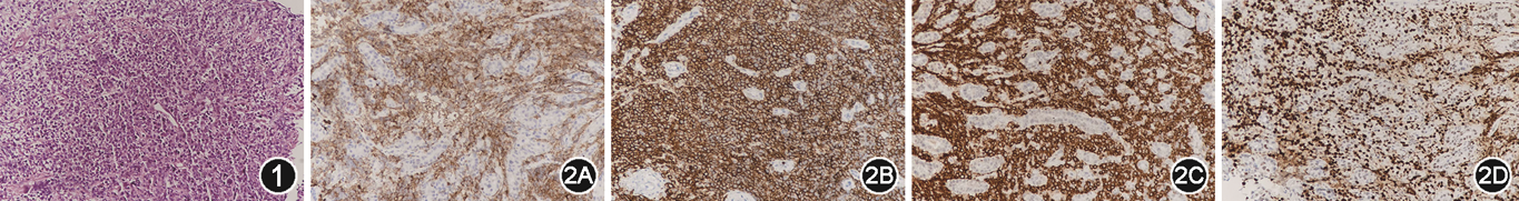 实验室检查(括号内为参考值范围):血常规示白细胞计数17.6×109/L(4.6×109~11.9×109/L),中性粒细胞比例0.770(0.220~0.570),中性粒细胞计数13.6×109/L(1.7×109~7.4×109/L),淋巴细胞比例0.173(0.220~0.570),淋巴细胞计数 3.0×109/L(1.7×109~4.7×109/L),红细胞计数2.4×1012/L(4.2×1012~5.7 ×1012/L),血红蛋白60 g/L(121~158 g/L),血小板计数571×109/L(177×109~446×109/L)。肝功能示总蛋白47.6 g/L(65~84 g/L),白蛋白26.0 g/L(39~54 g/L),乳酸脱氢酶 260 U/L(100~240 U/L),C反应蛋白17.12 mg/L(0~3.36 mg/L)。铁蛋白7.6 ng/L(14~142 ng/L),铁 5.1 μmol/L(13~32 μmol/L)。EB病毒核心抗原IgG抗体及衣壳抗原IgG抗体阳性,EB病毒衣壳抗原IgM 阴性。乙肝、丙肝、淋巴细胞亚群、巨细胞病毒、肾功能、凝血功能、粪常规等未见异常。血清Hp分型及抗体均阳性。腹部B超示胃壁明显增厚,肝肋下27 mm,腹腔少量积液。腹部CT示左侧胸膜增厚,胃窦部胃壁不均匀增厚,腹腔积液。骨髓细胞常规示增生性贫血骨髓象。胃镜下食管未见明显异常;胃底黏膜稍充血水肿,可见大量食糜;胃体和胃角可见一巨大不规则溃疡,底高低不平,覆盖污秽物和少许食糜,周围黏膜呈结节样改变,质脆,活检弹性差;胃窦黏膜稍充血水肿;幽门呈圆形,开放状态;十二指肠球部及降部黏膜光滑,形态正常。胃镜诊断:胃溃疡(性质待定)。胃窦黏膜组织病理可见中等偏大异型淋巴样细胞弥漫分布、少量白细胞(图1);考虑非霍奇金淋巴瘤;Hp阳性。免疫组织化学示CD3、CD5、CD7、CD43、Ki-67部分阳性;CD10、CD20、CD79a、Bcl-2、Bcl-6、Mum-1、Pax-5、c-myc、CKpan腺体均阳性;TdT、MPO、EBER、ALK均阴性。符合(胃窦)弥漫性大B细胞淋巴瘤,生发中心B细胞型(germinal centerers B-cell,GCB型)(图2A~2D)。