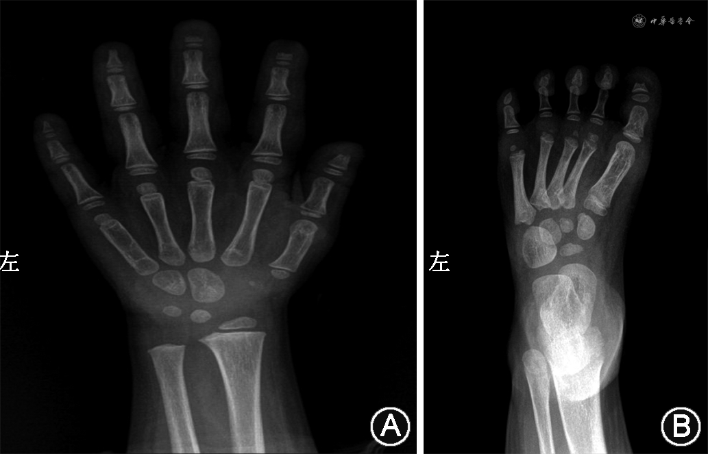 辅助检查:血常规、尿常规、肝肾功能、电解质、甲状腺功能、乙肝五项正常。生长激素激发试验示生长激素检测(空腹)1.3 μg/L;生长激素检测(30 min)4.0 μg/L;生长激素检测(60 min)9.3 μg/L;生长激素检测(90 min)9.9 μg/L;生长激素检测(120 min)3.7 μg/L,不完全缺乏。胰岛素样生长因子1 72.80 μg/L。微量元素六项示全血微量元素钙 1.60 mmol/L,镁 1.38 mmol/L,铁 7.53 mmol/L,铜 20.95 μmol/L,锌 68.86 μmol/L,铅 27.82 μg/L;甲状腺功能八项示三碘甲状腺原氨酸 2.51 nmol/L,余正常。空腹血糖 4.31 mmol/L;25-羟维生素D 67.0 nmol/L。骨密度示重度不足。心脏超声示心内结构及各心腔大小未见明显异常,左室收缩功能正常,彩色血流未见明显异常。泌尿系统超声示双肾囊肿。垂体磁共振成像示空泡蝶鞍,垂体高度约2.5 mm,垂体柄向右偏移;小脑扁桃体下疝畸形伴颅底凹陷,脊髓内异常信号影,考虑脊髓中央管扩张。胸椎、颈椎磁共振成像示Chiari畸形Ⅰ型(小脑扁桃体下疝畸形伴颅底凹陷,颈、胸段脊髓内异常信号影,考虑脊髓空洞);蝶鞍改变;胸椎多发蝴蝶椎。腕骨正位片示左腕骨5块,左腕骨龄符合3岁至3岁6月龄;左手第1~5指远节指骨部分骨质缺失,左足部X线片示第1趾末节趾骨部分骨质缺如(图1)。