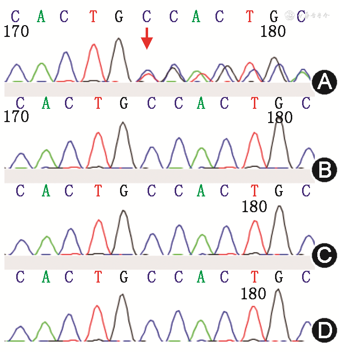 基因检测:家系全外显子和线粒体基因检测提示NOTCH2基因 c.6709-6710insCACA(p.S2237Tfs*8)杂合移码变异,受检者父母和姐姐均未检出该变异,新生变异(图2)。