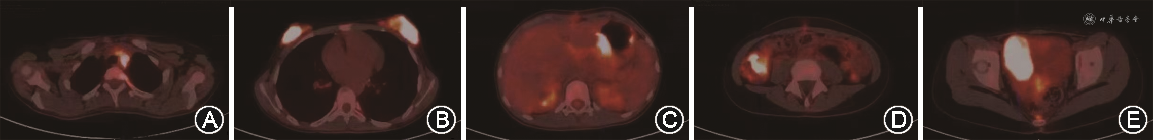辅助检查(括号内为参考值范围):血常规示白细胞计数11.7×109/L(5.2×109~9.1×109/L),中性粒细胞计数9.9×109/L(1.8×109~6.3×109/L),红细胞计数3.0×1012/L(4.0×1012~4.5×1012/L),血红蛋白85 g/L(115~150 g/L),血小板计数260×109/L(125×109~350×109/L)。生化检查示丙氨酸转氨酶409 U/L(9~52 U/L),天冬氨酸转氨酶488 U/L(14~36 U/L),γ谷氨酰转移酶262 U/L(38~126 U/L),白蛋白28 g/L(35~50 g/L),总胆红素73 μmol/L(0~20 μmol/L),结合胆红素52.6 μmol/L(0~6.8 μmol/L),未结合胆红素20 μmol/L(0~19 μmol/L),乳酸脱氢酶991 U/L(313~618 U/L),脂肪酶 1 951 U/L(23~300 U/L),血淀粉酶582 U/L(30~110 U/L),尿淀粉酶 1 542 U/L(0~450 U/L)。肿瘤六项正常。胰十二指肠术后病理蜡块至上海市临床病理读片会会诊示(小肠)髓系肉瘤侵及胰腺,免疫组织化学示肿瘤细胞CD20-,CD79a-,TDT-,CD99-,CD3-,CD10-,CD43+,CD34+,Ki67+(约60%),CKpan-,BCL2+,cyclinD1-,MPO+,CD68-,Lysozyme-。盆腔B超提示实质性占位(61 mm×41 mm×34 mm),盆腔增强磁共振成像示盆腔右侧占位,考虑来源右侧卵巢,性索间质肿瘤或转移瘤可能。18F-氟脱氧葡萄糖(18F-fluorodeoxyglucose,18F-FDG)正电子发射计算机断层显像(positron emission tomography-computed tomography,PET-CT)示胃、右半结肠、右侧附件区、双侧乳腺、左上胸腔胸膜、前中上纵隔及左侧腋窝淋巴结、左侧筛窦多发病变,伴18F-FDG代谢增高,考虑髓系源性恶性肿瘤(图1)。盆腔占位组织穿刺病理提示为髓系肉瘤。血涂片及骨髓涂片、活检、免疫分型均未见异常;融合基因检测:TLS-ERG融合基因阳性;染色体核型G带、R带分析:46,XX,t(16;21)(p11;q22)[2]。