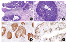 患者28岁,因性生活后出血1年于2017年3月19日入院。1年前患者出现性生活后阴道少量流血,无腹痛、腰酸等不适。患者月经规律,孕5产2,分别于2007、2016年行剖宫产术分娩。妇科检查:外阴无异常,阴道通畅;子宫颈后唇见约2.0 cm×1.5 cm大小的菜花状肿物,有触血;子宫正常大小,无压痛,双侧宫旁、附件区未扪及明显异常。血清鳞状细胞癌抗原(SCC-Ag)水平为3.8 μg/L。液基薄层细胞学检查(TCT)诊断为高级别鳞状上皮内病变(HSIL)。行阴道镜检查及子宫颈3、6、9点活检后病理诊断为:(子宫颈)HSIL累及腺体。遂于2017年3月23日行子宫颈锥切术,术后病理检查镜下观:子宫颈弥漫HSIL,累及腺体(图1);部分腺体由复层上皮组成,全层细胞的胞质含有黏液,部分胞质含空泡,部分胞质透明,细胞核拥挤,轻度核异型(图2),可见核分裂象及凋亡小体。免疫组化法检测:HSIL组织中弥漫表达p16、p63蛋白,非典型的产生黏液的细胞中弥漫表达p16蛋白(图3),局灶表达p63蛋白(图4)。细胞增殖相关核抗原(Ki-67)指数达90%。原位杂交法检测HPV16、18型阳性。术后病理诊断:子宫颈产生黏液的复层上皮内病变(stratified mucin-producing intraepithelial lesion,SMILE),合并HSIL并累及腺体,切缘阴性。