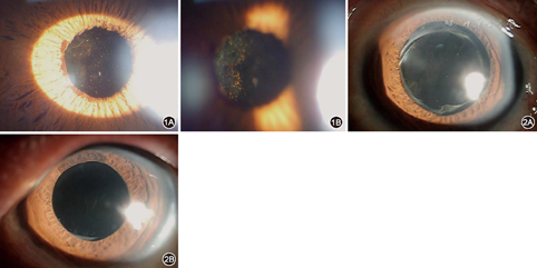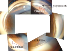 身体检查:视力右眼为0.5,左眼为0.5;眼压右眼为36 mmHg,左眼为17 mmHg;右眼外眼(–),角膜清,少许色素性角膜后沉积物,位于中下部,大小不一,前房深,前房内色素颗粒浮游(–),用拇指压住患者上睑缘,稍加用力在角膜表面做上下揉搓动作,反复几个来回后,再次观察前房内色素颗粒浮游(+++),操作前后色素明显增多,笔者称之为色素浮游"弹拨征"阳性,瞳孔圆形居中,直径3 mm、瞳孔缘色素较多(图1A),虹膜周切口11:00点钟方位通畅,IOL在位,前表面色素少量,后囊膜不见,玻璃体絮团状、内混色素颗粒较多(图1B),小瞳孔下眼底见视乳头色浅淡、C/D为0.8+、视乳头边沿下部呈坡状、上部1/3呈碟状压陷;复方托吡卡胺滴眼液多次散大瞳孔后:瞳孔直径约6~7 mm,IOL位于囊袋前,整体与虹膜后面相贴附,略向鼻下偏位,颞下襻(近光学部暴露)可见位于7:00位;瞳孔缘内颞上少许玻璃体由IOL赤道外突入前房(图2A)。左眼:外眼无异常,IOL在位、后囊膜完整,余前节无特殊(图2B),小瞳孔下眼底见视乳头色浅、C/D 0.6–,盘沿正常。前房角镜:右眼除外1:00点钟方位和7:00点钟方位两处宽基底前粘连(应与IOL两襻抵压相应虹膜根部有关),其余均为宽角,小梁网色素沉着除外11:00点钟方位虹膜周切口附近为Ⅱ级,其余均为Ⅲ~Ⅳ级,呈致密深褐色或黑色绒样带状分布,尤其下方可见Sampaolesi色素线(schwalbe线前方角膜内皮的色素沉着线,称Sampaolesi)(图3)。左眼全周宽角,鼻上11:00点钟方位虹膜周切口通畅,小梁网色素沉着鼻下约Ⅱ级、下方和颞下Ⅰ~Ⅱ级、其余0~Ⅰ级,呈稀疏浅褐色。其他辅助检查:角膜厚度(2012年8月31日)右眼为572 μm、左眼为599 μm;视野(2013年7月1日)右眼为中央管状视野,左眼无特异性损伤。2012年6月13日检查双眼视野正常。