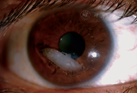右眼准分子激光原位角膜磨镶术后角膜瓣下上皮植入患者右眼前节彩色图像,可见角膜上皮由颞下方及下方角膜瓣缘损伤处植入,植入上皮整体呈斜行舟状,颞下方可见植入上皮呈水滴状,波及瞳孔区,角膜瓣颞下方边缘不规则,部分融解