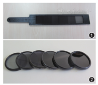 对RAPD进行定量检测时可使用线状中性密度滤镜(图1)或摄影用不同单位的中性密度滤镜片(图2)。使用中性密度滤镜对RAPD行定量检测的原理:采用交替光照试验行RAPD检查时,将中性密度滤镜置于"健眼"前或光源前(图3,图4),中性滤镜可过滤部分光线,适当单位的中性密度滤镜可使双眼瞳孔反应平衡,以此时所用中性密度滤镜的单位表示"患眼"RAPD的程度[5,10,11,19,20,21,22]。需要注意的是,部分伴有单侧瞳孔功能障碍的患者,使用中性密度滤镜行RAPD定量检测时,因"患眼"瞳孔收缩功能障碍,双眼瞳孔对光反应难以达到平衡,增加了RAPD定量测定的难度。当怀疑一眼瞳孔有轻度RAPD时,可使用中性密度滤镜行RAPD诱导试验。采用交替光照试验,光线照射双眼瞳孔时分别将0.3 log单位滤镜置于眼前或光源前。当滤镜置于患眼前时RAPD更明显、置于健眼前无明显RAPD时,证实"患眼"RAPD阳性[5,12,13,22,23,24,25]。