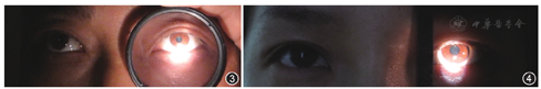 瞳孔对光反应检查包括直接对光反应检查和间接对光反应检查。直接对光反应是指在暗光线环境中,用适度光源直接照射一眼瞳孔时,该眼瞳孔缩小。间接对光反应是指在适度光源照射一眼瞳孔时,对侧眼瞳孔缩小。检查时可使用间接检眼镜或聚光式手电筒光源。光源照射一眼瞳孔时,尽可能避免影响对侧眼。检查时用光源照射一眼瞳孔,观察双眼的瞳孔对光反应。在观察瞳孔间接对光反应时,同时用一个暗光源斜照对侧被观察眼效果更佳[6,8]。
