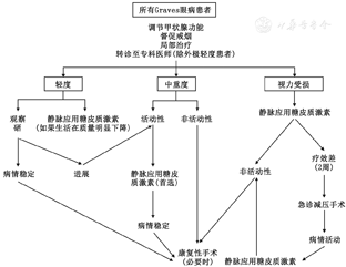 评估不当或治疗不充分易导致GO复发或并发症增加。因此推荐初级保健医师、全科医师、一般内科医师和专科医师将GO患者转诊至甲状腺-眼联合门诊或有内分泌和眼科专家的专科中心,除了那些通过调节甲状腺功能和局部应用润眼液可以恢复正常的极轻度患者(图1)。