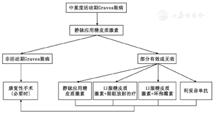 由于甲亢和甲减都会加重GO病情,因此,出现GO时应尽快恢复甲状腺功能正常并维持稳定。抗甲状腺药物和甲状腺手术本身并不会影响GO的自然病程。而放射性碘治疗则已明确会促进GO发生或加重,但这种影响可以通过联合口服糖皮质激素来预防。应根据患者的具体情况来选择这3种治疗方案,对于吸烟、严重甲亢和新近出现的甲亢患者,在接受放射性碘治疗时,应口服强的松预防,起始剂量为强尼松0.3~0.5 g·kg-1·d-1,疗程为3个月。