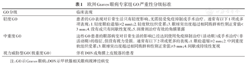 为每个患者选择最适合的治疗方案要基于其眼部病变的活动性和严重性。2016版指南继续沿用2008版共识中的标准来评估GO的活动性和严重性,将GO按活动性分为活动期和非活动期,按严重性分为轻度、中重度和视力威胁型(极重度)(表1)。GO临床活动性采用CAS评分标准,以下7项中出现3项以上为活动期GO,否则为非活动期GO。(1)自发性球后疼痛;(2)眼球转动时诱发疼痛;(3)眼睑充血;(4)结膜充血;(5)泪阜或皱襞肿胀;(6)眼睑肿胀;(7)结膜水肿。