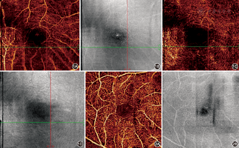 尽管FFA检查可观察视网膜毛细血管,但其无法显示全部的血管,如视盘周围放射状毛细血管[8]和深层视网膜毛细血管[9]。而使用OCTA,可以获得视网膜脉络膜血管网络的三维图像,显示视网膜不同层次的血流,观察视盘周围毛细血管网和内、外层视网膜血管丛[10]。