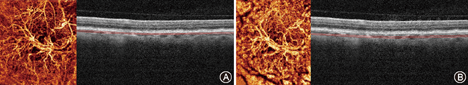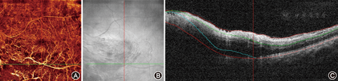 由于与蛋白的结合率高且入射光的波长较长,故ICGA可以显示RPE下血管。然而,吲哚氰绿的对比度低,无法明确显示血管的准确位置。OCTA可以分层显示RPE下的血管,不仅能够明确血管的位置,而且具有较高的分辨率[12]。