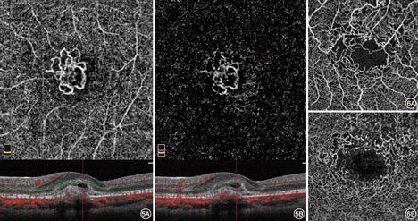OCTA仅显示血流形态,无法显示传统FFA的渗漏、积存或着染等现象[11]。然而,正是因为无法显示上述现象,OCTA可以更加清晰地显示异常微血管的结构。