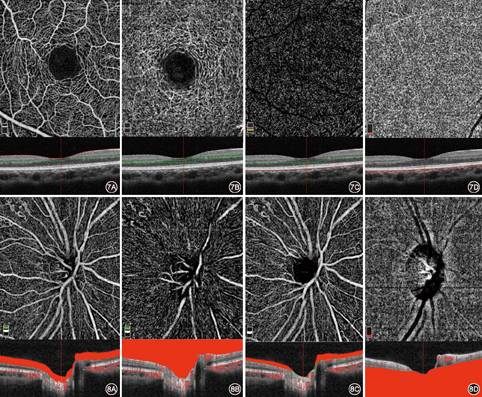 正常视盘的OCTA图像可见大血管走行自然,视盘内及视盘周围各象限的毛细血管分布均匀,无缺损。通常可配合神经纤维层厚度测量,综合评估视盘周围毛细血管的分布情况(图8)。