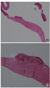 患者男性,77岁。因左眼无痛性视力下降2个月,于2016年5月9日就诊于苏州大学附属第一医院眼科。4个月前因右眼老年性白内障于本院行右眼超声乳化白内障摘除联合IOL植入术,术后恢复良好。否认全身疾病和既往眼部疾病史。全身体检未见异常。眼部检查:左眼裸眼视力为眼前60 cm指数,矫正无提高;眼压(非接触眼压计测量)为12.0 mmHg(1 mmHg=0.133 kPa),眼睑无红肿和内外翻、倒睫,睑板腺结构清晰,结膜无充血、水肿,角膜可见老年环,未见角膜血管翳,颞侧3点半方位可见浅层结节状胶样隆起,边界欠清,荧光素钠染色阴性,无角膜后沉着物,前房深,房水清,无房水闪光,虹膜纹理清晰,瞳孔圆,直径为3 mm,对光反应灵敏,晶状体混浊,眼底未见异常(图1)。左眼前节OCT检查:稍高密度结节位于角膜上皮下和Bowman层前(图2)。角膜地形图检查:左眼角膜高度不规则散光(图3)。右眼裸眼视力为0.6,眼压14.0 mmHg,角膜透明,前房深,虹膜纹理清晰,瞳孔圆,瞳孔直径为3 mm,对光反应灵敏,IOL在位,余未见明显异常。临床诊断:左眼Salzmann结节样角膜变性(Salzmann's nodular degeneration,SND),双眼老年性白内障,右眼白内障摘除IOL植入术后。因患者强烈要求行白内障摘除手术,在与患者及其家属充分沟通后,于2016年5月13日行左眼表层角膜切削术,术后配戴绷带镜,术中切除组织进行病理学检查(图4,图5,图6,图7)。术后3周,行左眼超声乳化白内障摘除联合IOL植入术。术后1个月复查,左眼裸眼视力为0.5。