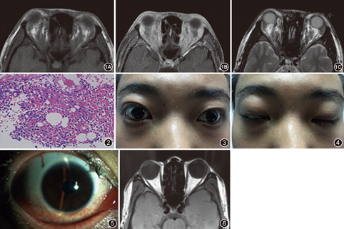 患者男性,21岁。因双眼球进行性突出伴酸痛不适2个月,于2016年1月14日就诊福建医科大学附属协和医院眼科。2个月前患者无明显诱因出现双眼球突出伴眼部酸痛不适,无视物模糊、复视,无怕热、多汗、心悸,无发热、畏冷、头晕、乏力等不适,家族中无类似病史,未予重视,症状无改善。1个月前就诊当地医院,诊断"甲状腺相关性眼病"并予对症处理(具体不详),眼球进行性突出。1周前转诊外院,查血常规:白细胞28.01×109/L,血红蛋白137 g/L,血小板111×109/L,甲状腺功能正常,骨髓检查示急性粒细胞白血病,眼眶MRI+增强示双侧眼球突出,眼肌、视神经不规则增粗、边缘模糊,眶内脂肪信号不均,见弥漫性软组织信号影,增强呈明显不均匀强化,双眼眶上静脉明显增粗(图1中A~C),考虑"白血病眼眶浸润",转诊我院。全身体检:胸骨压痛明显,全身浅表淋巴结未触及,甲状腺功能正常。骨髓穿刺活检病理示骨髓腔内弥漫均一的原始细胞浸润,细胞质少,核不规则,核仁不明显,提示急性白血病(图2);网状纤维(+);骨髓常规细胞学检查示:骨髓有核细胞增生明显活跃,原幼单核细胞占37.5%,原幼淋巴细胞占23.5%,粒系、红系增生减低,骨髓流式细胞仪检查结果:74.9%细胞(占全部有核细胞)表达CD4、CD10、CD19、CD22、CyCD79a、HLA-DR、CD34、CD13、CD15、CD33,诊断为急性混合细胞白血病(mixed acute leukemia,MAL)。眼部情况:双眼球突出(眼球突出度:右眼20 mm,左眼19 mm,眶距104 mm)(图3),眼球各方向转动受限,眶压增高,眶部轻压痛,眶缘可扪及肿物,质中,固定,境界不清,无搏动感。右眼睑闭合不全(图4),球结膜充血水肿(图5);左眼睑闭合尚可,球结膜轻度充血水肿。双眼视力、眼压、眼前节、眼底、视野检查未见异常。明确诊断后予IA+VCP方案[伊达比星8 mg/m2 1次/日,静脉滴注,化学治疗第1~3天(D1~3);阿糖胞苷100 mg 2次/日,静脉滴注D1~5;长春地辛4 mg 1次/日,静脉滴注D1、8、17;环磷酰胺750 mg/m2 1次/日,静脉滴注D1、17;泼尼松20 mg 3次/日、口服D1~14,20 mg 2次/日、口服D15~28]诱导化学治疗,化学治疗第2天,患者眼部胀痛明显好转,双侧眼球突出明显改善。化学治疗第16天时患者再诉双侧眼球肿胀不适,骨髓涂片示:有核细胞增生活跃,原幼单核细胞占50.5%,原幼淋巴细胞占22.5%,染色体回报4,XY,t(9;22)(q34;q11.2),BCR/ABL融合基因阳性,再予阿糖胞苷(100 mg 2次/日,静脉滴注D1~2)化学治疗1次,加用甲磺酸伊马替尼(400 mg 1次/日口服)靶向治疗,患者眼部胀痛再次缓解。此后继予伊马替尼靶向治疗及IA方案(伊达比星10 mg/m2 1次/日,静脉滴注D1~3;阿糖胞苷100 mg 2次/日,静脉滴注D1~7)化学治疗1个疗程,患者眼部胀痛缓解,眼球突出无恶化,眼球突出度:右眼17 mm,左眼16 mm(眶距104 mm),眼眶MRI+增强示眼球、眼眶内未见占位病变,眼肌无增粗、信号未见明显异常(图6)。患者2016年10月22日行异基因造血干细胞移植,移植过程顺利。2017年10月23日复查见血常规幼稚细胞占54%,考虑复发,拟择期再次行异基因造血干细胞移植。