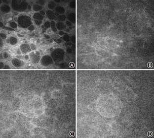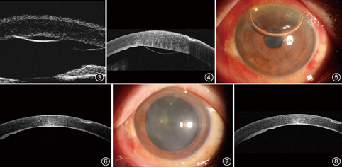患者男性,51岁。因左眼视力下降1个月余,于2016年10月9日被第四军医大学西京医院眼科收入院。患者既往40年前右眼外伤史,视力轻度下降,未行进一步检查及治疗;4个月前因铁屑溅入左眼于当地医院行左眼角膜异物剔除术及结膜囊冲洗,术后给予抗生素眼液治疗,患者眼压、视力无变化。约1个月之前无明显诱因出现左眼视力下降,于当地医院诊断角膜炎,给予对症处理后视力无明显改善。患者无特殊个人史及家族史。入院查体:全身检查无特殊,眼科检查:视力:右眼0.08,左眼0.08,矫正:右眼0.1,左眼0.1,眼压:右眼19 mmHg(1 mmHg=0.133 kPa),左眼14 mmHg。右眼结膜无充血,角膜下方片状云翳,前房中深,瞳孔欠圆,直径约3 mm,对光反应迟钝,晶状体皮质片状混浊,玻璃体混浊,眼底未见明显异常。左眼结膜充血,角膜中央及颞侧基质水肿混浊,内皮皱褶(++),鼻侧内皮反光增强,中央偏颞侧见一针尖大小凹陷,累及浅基质层,前房中深,瞳孔圆,直径约3 mm,对光反应灵敏,晶状体皮质轻混,玻璃体及眼底窥不清(图1)。初步拟诊为左眼角膜炎、左眼角膜内皮失代偿。门诊相关检查:角膜共聚焦显微镜检查示:右眼下方病变区角膜上皮细胞层粗糙、干燥,上皮下神经纤维较稀少,病变区浅基质细胞层可见片状高反光(瘢痕组织结构),病变区其余基质细胞及内皮细胞尚可。左眼中央病变区角膜上皮细胞层可见上皮水泡、水肿,上皮下神经纤维缺失,基质细胞肿胀模糊,基质水肿明显,内皮细胞不成像,鼻侧透明区内皮细胞尚可(图2)。考虑患者左眼病毒性角膜炎可能性大,给予更昔洛韦眼用凝胶点左眼4次/d,醋酸泼尼松龙眼液点左眼4次/d,阿昔洛韦片0.4g,口服,3次/d,治疗3天后患者症状无缓解。进一步进行超声生物显微镜检查可见双眼全周房角开放,左眼角膜水肿,左眼角膜后弹力层脱离(descemet membrane detachment,DMD),右眼晶状体混浊(图3)。前节OCT检查结果可见左眼DMD达2/3范围(图4)。修正诊断为左眼DMD。经患者及家属知情同意后于表面麻醉下行左眼前房注气术,术前行左眼激光周边虹膜切除术预防术后高眼压,术中注入消毒空气0.8 ml,嘱患者平卧位。术后第1天左眼视力0.12,矫正至0.3,眼压18 mmHg,坐位时前房上3/4气体填充,角膜后弹力层基本复位;术后第2天左眼视力0.2,矫正至0.4,眼压15 mmHg,坐位时前房上1/2气体填充(图5),前节OCT检查结果可见左眼角膜后弹力层完全复位(图6),患者出院。术后1周门诊复查,左眼视力0.4,矫正至0.8,眼压13 mmHg,角膜透明,角膜水肿基本消失,后弹力层完全复位,前房气体完全吸收。术后1个月门诊复查,左眼视力0.6,矫正至1.0,眼压13 mmHg,角膜水肿消失,恢复透明(图7),后弹力层完全复位(图8)。经过半年规律随访,患者视力稳定,角膜后弹力层完全复位。