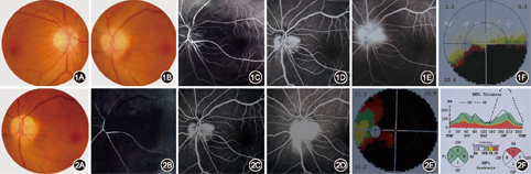 患者女性,54岁。因左眼视力急剧下降10 d,于2015年1月5日就诊于浙江大学医学院附属第二医院眼科中心。患者曾在当地医院诊为"左眼视神经炎",给予口服激素和神经营养药物治疗,无好转。既往有高血压病史2年,口服苯磺酸氨氯地平片治疗,血压控制平稳。患者5个月前曾因左眼下半侧视物不见1周就诊于浙江大学医学院附属第二医院,当时眼部检查:视力右眼1.0,左眼0.6,右眼视盘色、界正常,视杯不明显,左眼视盘上部轻度水肿,边界模糊(图1A、图1B)。FFA示造影早期左眼后极部脉络膜充盈迟缓,视盘上部呈低荧光,视盘中部毛细血管扩张、渗漏荧光素;造影晚期视盘呈弥漫性强荧光,但视盘上部荧光稍弱(图1C,图1D,图1E)。视野检查示左眼下半侧视野缺损,中心注视点尚未受累及(图1F)。当时诊断为左眼前部缺血性视神经病变(anterior ischemic optic neuropathy, AION),药物治疗无明显效果。