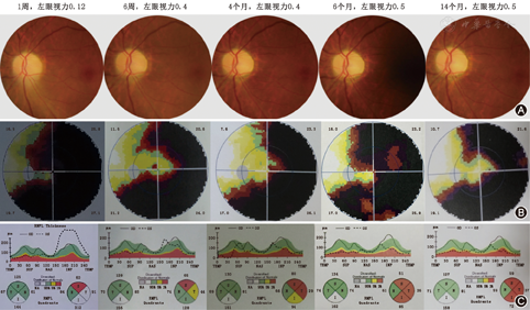 本次就诊患者全身体检未见明显异常,头部颞侧皮肤未扪及条索状硬结。辅助检查:血常规、尿常规、肝肾功能、凝血检查、红细胞沉降率、C反应蛋白、免疫球蛋白及补体、抗核抗体、心磷脂抗体、风疹病毒、巨细胞病毒、单纯疱疹病毒、弓形虫、艾滋病、梅毒、乙型肝炎和丙型肝炎检查均无异常。24 h动态血压监测:收缩压最高值124 mmHg(1 mmHg=0.133 kPa),舒张压最高值95 mmHg(10 Am);收缩压最低值88 mmHg,舒张压最低值52 mmHg(12 Pm)。眼部检查:视力右眼1.0,左眼0.08,矫正不提高。右眼前节正常,视盘色、界正常,视杯不明显。左眼角膜透明,前房适中,瞳孔4 mm,相对性传入性瞳孔障碍阳性,视盘上部苍白,下部轻度充血、水肿、边界模糊(图2A)。眼压右眼16.4 mmHg,左眼15.7 mmHg。FFA示造影早期左眼视盘和后极部脉络膜充盈迟缓,视盘上部呈低荧光,视盘中部毛细血管扩张、渗漏荧光素,造影晚期视盘中下部呈弥漫性强荧光,视盘上部呈持续性低荧光(图2B,图2C,图2D)。视野检查示左眼上、下半侧视野缺损,仅残留颞侧视岛(图2E)。OCT检查示左眼视盘上方盘周视网膜神经纤维层(retinal nerve fiber layer,RNFL)明显变薄,视盘鼻、颞侧和下方盘周RNFL明显增厚,下方盘周RNFL增厚尤为明显(图2F)。视觉电生理检查示双眼视网膜电图正常,VEP左眼P100波幅明显降低,潜时延长;右眼P100波幅和潜时均正常。眼眶MRI增强检查示双眼视神经未见异常。诊断为左眼复发性非动脉炎性AION。口服甲泼尼龙40 mg,1次/d,逐渐减量;维生素B12 500 μg,3次/d;胞磷胆碱0.2 g,3次/d。注射用鼠神经生长因子15 000 U,肌内注射,1次/d。复方樟柳碱注射液2 ml,左颞侧皮下注射,1次/d。治疗期间左眼视盘下部水肿逐渐减退,边界逐渐清晰,视力和视野也逐渐改善(图3中A、B)。1周后,左眼视盘下部水肿明显消退,但下方视盘边缘仍模糊,视力提高至0.12,视野呈管状视野+颞侧视岛。6周后,左眼全视盘苍白,边界基本清晰,视力提高至0.4,视野表现为绕开中心注视点的下半侧视野缺损+鼻上象限盲。6个月后视力改善至0.5并保持稳定, 14个月后末次复诊时左眼视野仍为绕开中心注视点的下半侧视野缺损+鼻上象限盲,但中央可见区有所扩大。OCT检查示AION复发后6个月内左眼视盘鼻、颞侧和下方盘周RNFL厚度先逐渐降至正常,随后视盘颞侧和下方盘周RNFL继续变薄,6个月后视盘颞侧和下方盘周RNFL厚度基本保持稳定(图3中C)。