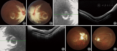 患儿男性,3岁。父母发现患儿自幼双眼视力差,于2017年3月14日就诊于复旦大学附属眼耳鼻喉科医院眼科。全身体检:未见明显异常。眼部检查:最佳矫正视力右眼为0.1(-6.00 D),左眼为0.08(-6.50 D);双眼外眼及前节未见明显异常;双眼视盘周围白色斑块,边缘呈羽毛状,病灶沿神经纤维分布;双眼黄斑部亦可见白色羽毛样改变(图1);OCT检查:双眼后极部神经纤维层呈高反射信号,神经纤维层前可见中低信号物质,可能为视网膜前胶质增生或玻璃体后皮质异常堆积(图2)。临床诊断:双眼RMNF。对患儿的父母进行检查,发现其母亲双眼视盘周围也有白色斑块,呈羽毛状分布,双眼视盘发育不良,高度近视眼样改变(图3)。患儿及其母亲均未给予特殊治疗,定期随访观察。