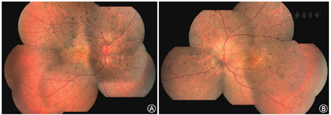 双眼Bietti结晶样视网膜变性患者彩色眼底拼图(A示右眼;B示左眼),双眼视盘边界清,全视网膜范围内,尤其后极部及中周部视网膜,可见散在黄白色闪光结晶样物质沉淀,后极部色素上皮层萎缩,透见脉络膜大血管,中周部可见少量骨细胞样色素沉积