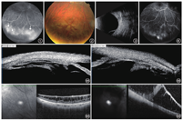 葡萄膜炎并发的视网膜劈裂常在炎性反应活动后几年出现,多见于下方象限,在下方锯齿缘上覆盖有大量渗出[6],表现为小范围的周边视网膜抬高,其上有血管走行但视网膜厚度菲薄、透明度较好,呈透明青灰色,部分患者存在明确的牵拉。由于位置太靠周边或屈光间质混浊,早期很难发现,相干光层析成像术及眼底像容易漏诊,未累及黄斑时无明显症状,因此常被忽视。随时间进展,劈裂范围扩大,表现为内层视网膜缓慢抬高。在罕见病例中,劈裂可远达后极部血管弓周围,或隆起高度较高,此时检查者难以除外慢性的孔源性视网膜脱离[5]。视网膜劈裂与视网膜脱离的鉴别极具挑战性,眼部B超以及超声生物显微镜对于此类疾病的发现有重要价值。