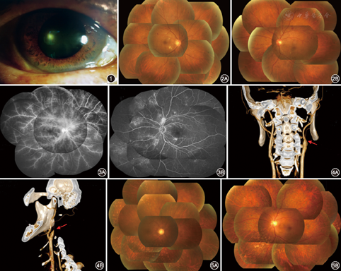 例1 患者男性,63岁。2016年9月4日无明显诱因出现右眼突发性视力下降伴眼痛,外院诊断"双眼糖尿病视网膜病变,右眼新生血管性青光眼",予派立明、马来酸噻吗洛尔滴眼液滴眼,阿司匹林、醋酰唑胺口服,症状未见明显缓解,于2016年9月18日在北京协和医院眼科就诊。患者既往2型糖尿病病史10年,高血压病史5年,目前血糖、血压控制平稳。无眼部外伤及手术史。眼部检查:视力:右眼数指,左眼0.8;眼压:右眼24 mmHg(1 mmHg=0.133 kPa),左眼18 mmHg。右眼球结膜混合性充血,角膜透明,角膜后沉积物(-),房水闪光(-),虹膜颞侧及下方粗大新生血管(图1),瞳孔散大,直径6 mm,对光反应迟钝,玻璃体轻度混浊。左眼前节正常。散大瞳孔后行眼底检查可见双眼视盘边界清,视网膜动脉纤细,静脉扩张,动静脉直径比约1∶3,多处动静脉交叉征,后极部点片状出血及棉絮斑,右眼重于左眼(图2)。右眼视盘上动脉搏动。荧光素眼底血管造影(fluorescence fundus angiography,FFA)检查可见右眼臂-视网膜循环时间延长24.03 s,视网膜动脉充盈呈前锋现象,视盘上动脉搏动,视网膜动、静脉及毛细血管均扩张,造影过程中血管管壁荧光着染,散在高荧光点。左眼眼底散在较多高荧光点及毛细血管无灌注区,出血斑遮挡背景荧光,视网膜动脉细,动静脉直径比约1∶3,动静脉交叉征(图3)。相干光层析成像术(optical coherence tomography,OCT)检查可见双眼黄斑区正常。初步诊断:右眼视盘动脉搏动原因待查,右眼新生血管青光眼,双眼糖尿病视网膜病变,双眼高血压视网膜动脉硬化。请血管外科、神经内科会诊,颈动脉彩色超声多普勒成像(color doppler flow imaging,CDFI)显示双侧颈部动脉内中膜稍增厚伴多发粥样硬化斑块形成,右侧颈内动脉狭窄≥50%,颈动脉计算机断层血管造影(computed tomography angiography,CTA)显示:右颈内动脉C6~C7段狭窄50%~70%(重度狭窄),C1~C5段狭窄100%(完全闭塞)(图4)。确诊为右眼眼缺血综合征。因手术风险较大,血管外科建议口服药物保守治疗。给予双眼底激光光凝术、右眼玻璃体腔注射雷珠单克隆抗体0.5 mg 1次、曲安奈德16 mg球侧注射2次、盐酸卡替洛尔滴眼液2次/d,口服羟苯磺酸钙胶囊0.5g 3次/d、肠溶阿司匹林50 g每晚1次、复方丹参滴丸3次/d(每次10粒)。患者规律用药,定期门诊复查,自觉症状逐渐好转,6个月后复查,右眼最佳矫正视力提高至0.02,眼压20.7 mmHg,虹膜仅下方残留小片新生血管,双眼散大瞳孔后眼底检查可见右眼视盘上动脉搏动消失。双眼底出血吸收,微血管瘤及棉絮斑消退,周边部可见激光斑(图5)。