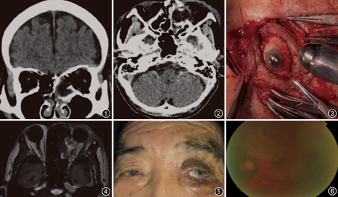 患者男性,70岁。因外伤后左眼视物不见10 d,于2018年8月21日就诊解放军南部战区总医院眼科。患者10 d前骑车时摔倒,倒地时左侧颞部撞击车把手,当即左眼视物不见伴左眼眶疼痛,无昏迷、恶心、呕吐、流涕等不适,当地医院予眼睑伤口清创缝合并建议患者转院。患者辗转几家医院,未获进一步处理。入院眼科检查:左眼视力无光感,上睑皮肤裂伤已缝合,上睑下垂,左眼眶内空虚;右眼视力0.8,右眼除晶状体轻度混浊外余未见明显异常。眼眶CT检查显示:左侧筛骨纸板、眶下壁、眶上壁骨折(图1),左眼球向内下方移位嵌顿于筛窦,眼球形态大致正常(图2)。诊断:(1)左眼眶爆裂性骨折;(2)左眼球脱位筛窦嵌顿;(3)右眼老年性白内障。诊断明确后,患者于2018年8月22日全身麻醉下行鼻内窥镜下左眼球复位+眼眶骨折重建术。手术步骤:(1)选择上下眼眶周弧形切口,上眼眶切口沿原眼睑伤口向内延伸,长约5 cm,沿眶骨膜向后分离暴露骨折和眼球嵌顿处;(2)见内侧壁骨片粉碎,微型咬骨钳小心咬除鼻腔侧粉碎骨板并扩大眼眶内壁骨折口松解眼球嵌顿;(3)内窥镜下由鼻腔清理骨折及软组织,沿眼球移位周围扩大鼻腔侧间隙和嵌顿;(4)内窥镜辅助下使用剥离子仔细探查和松解眼球嵌顿,见眼球内、外节制韧带均断裂,眼外肌存在,视神经显露不清晰;(5)在眼眶内钳夹眶内脂肪体,并在鼻内镜辅助下将眼球复位至眼眶,见左眼角膜水肿,瞳孔散大约4 mm×4 mm,对光反射消失(图3);(6)眶内壁骨折破损区使用钛网塑形修复固定;(7)修复撕裂的内外眦韧带,缝合手术切口。术后给予克林霉素、甲硝唑抗感染,白眉蛇毒血凝酶、卡络磺钠止血,地塞米松抗炎消水肿、甲钴胺、鼠神经生长因子营养神经药物,磷酸肌酸钠改善肌肉代谢等对症治疗处理。术后第3天,左眼视力光感,光定位准确,角膜水肿较前好转,眼球活动受限。术后1个月复查,左眼最佳矫正视力0.01,光定位准。MRI提示左眼眶内见网格样金属伪影,左眼球位置尚可,大小形态正常(图4)。术后3个月复查,眼球外上固定(图5),左眼最佳矫正视力0.05,角膜透明,前房深度可,虹膜纹理清晰,瞳孔正圆,4 mm×4 mm,对光反射迟钝,晶状体中度核性混浊,眼底视盘边界清晰,色淡红,杯盘比0.4,血管走行可,视网膜平伏(图6)。