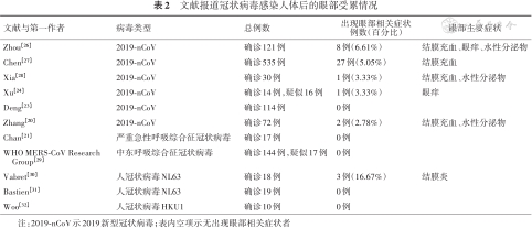 | Zhang[20] | 2019-nCoV | 确诊72例 | 2例(2.78%) | 结膜充血、水性分泌物 |