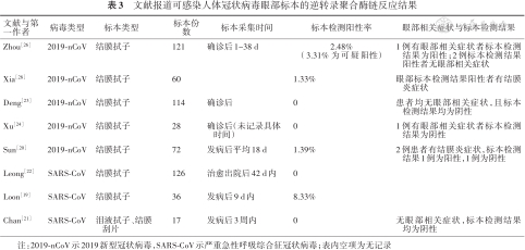 | Chan[21] | SARS-CoV | 泪液拭子、结膜 刮片 | 17 | 发病后3周内 | 0 | 无眼部相关症状,标本检测结果均为阴性 |