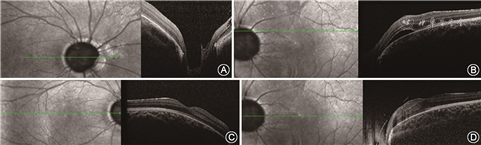 其母未见明显眼部异常,父亲视力为右眼20 cm手动,矫正不提高,左眼0.4矫正至0.8,前节无明显异常,散瞳查眼底可见右眼视盘增大,血管走行异常,盘周可见环形萎缩弧;左眼视盘大小正常,视网膜血管数目增多,自盘周放射状发出,可见视盘鼻侧有髓神经纤维及黄斑区视网膜劈裂(图3)。OCT同样可见视杯深而宽,左眼黄斑区及盘周视网膜劈裂,右眼黄斑区视网膜神经上皮浅脱离(图4)。先证者妹妹双眼矫正视力为0.2,眼前节未见明显异常,散瞳查眼底可见双眼视盘大小、血管数量及走行大致正常,视杯宽而深,颞侧盘沿窄(图5)。OCT可见宽而深的视杯,黄斑区未见明显异常(图6)。