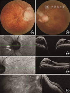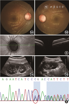 先证者为5岁男童,自幼双眼内斜视,眼部检查示:双眼视杯宽而深,有多发睫状视网膜血管自盘周呈放射状发出,左眼可见视网膜神经上皮脱离。对先证者父母及妹妹行眼科检查,其父自述自幼右眼视力极差,10年前有肾移植病史。眼部检查示先证者父亲右眼视盘增大,血管走行异常,左眼视盘大小正常,多发视网膜血管自盘周放射状发出,可见黄斑区及视盘周围视网膜劈裂,右眼黄斑区视网膜神经上皮浅脱离。先证者妹妹双眼视杯宽而深,血管走行大致正常,黄斑区无明显异常。肾脏彩超及尿常规检查示先证者及其妹妹均可见双侧肾脏钙化灶及肾盂分离,轻度蛋白尿。基因检测结果示:先证者及其父亲、妹妹均存在PAX2基因c.419_421delGGA杂合突变。结合上述检查结果,诊断为:肾-视神经乳头缺损综合征。(中华眼科杂志,2021,57:454-457)