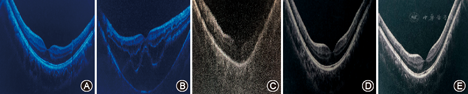 患者哥哥,16岁。因双眼视力下降6个月,于2018年9月29日就诊于天津医科大学眼科医院。全身体检:身高为2.05 m,瘦高体型,蜘蛛状指(趾),胸廓形态正常,心前区无隆起;超声心动图:主动脉根部扩张,二尖瓣松软、膨隆并少量反流,主动脉瓣反流(少量);左心室增大。眼部检查:右眼裸眼视力为0.5,矫正视力为0.9(+5.75 DS -2.50 DC×10°);左眼裸眼视力为0.5,矫正视力为0.9(+6.00 DS-2.50 DC ×170°);眼压右眼为9.8 mmHg,左眼为11.0 mmHg;眼轴长度右眼为30.12 mm,左眼为29.53 mm。双眼外眼无异常,角膜透明,前房深度正常,右眼晶状体向上方脱位,左眼晶状体向颞上方脱位(图1中C和D);双眼豹纹状眼底(图2中C和D)。角膜地形图(Pentacam三维眼前节分析仪):双眼角膜曲率较平,前表面曲率右眼为40.8 D,左眼为40.6 D(图3中C和D)。OCT检查未见异常(图4中D和E)。临床诊断:马方综合征;双眼晶状体半脱位;双眼高度近视眼视网膜病变。眼部生物学参数见表1。