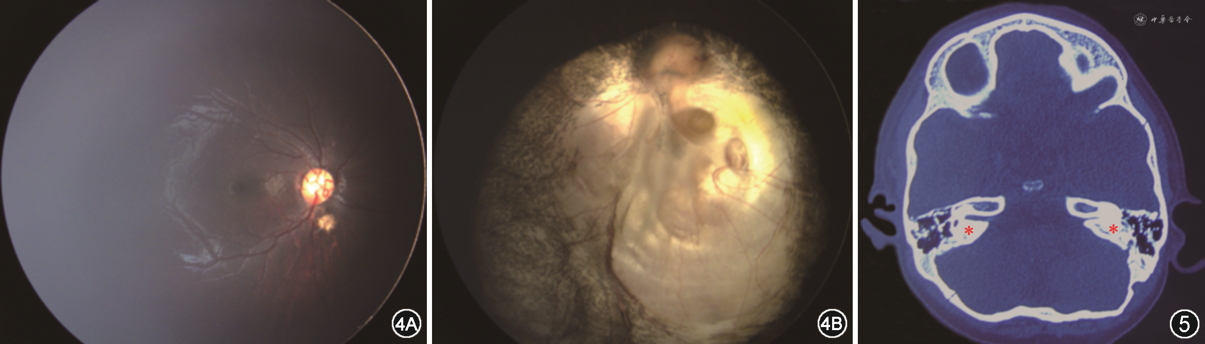 查体:患儿精神一般,行走不稳;面部不对称,左侧鼻唇沟变浅,额纹消失,口角向右侧偏斜(图1);右耳廓形态畸形,左耳廓结构畸形,部分缺损(图2,3),双侧外耳道未见明显异常;心前区未闻及病理性杂音。眼科检查:视力:条栅无明显注视行为,视动性眼震仪双眼阳性,单眼遮盖拒绝;眼位:33 cm映光交替遮盖:正位至+15°,偶有L/R 5°;遮盖去遮盖检查不配合;双眼各方位运动无明显受限,左眼睑闭合欠佳,双眼结膜无充血,角膜透明,瞳孔圆,直径约2.5 mm,直接、间接对光反射灵敏,晶状体透明。广角数码儿童视网膜成像系统(RetCam3,美国Clarity公司)眼底检查:右眼视盘边界清,色淡红,视网膜平伏,血管走行可,视盘下方见1/4 视盘直径大小脉络膜缺损灶(图4A);左眼视网膜平伏,下方大片状脉络膜缺损灶累及视盘及黄斑区(图4B)。1%阿托品散大瞳孔验光:右眼+1.75 DS(矫正不理解),左眼-9.00 DS(矫正不理解)。眼部B超:眼轴长右眼20.8 mm,左眼24 mm,左眼球后壁不光滑,双眼未见视网膜脱离光带。纤维鼻咽喉镜检查:双侧腺样体稍大,双侧扁桃体大,鼻部发育无异常。颞骨CT检查:左侧听小骨发育不良,左侧蜗神经闭塞,左侧内听道狭窄,右侧蜗神经孔稍窄,双侧半规管显示不良,提示发育不全(图5)。听力检查提示双耳感音神经性耳聋(左耳极重度)。心脏彩色超声检查:动脉导管结扎术后,血流正常。泌尿生殖系统B超检查未见明显异常。外周血行NGS基因检测结果显示:患儿CHD7基因发现c.3392T>C(编码区第3392号核苷酸由T变为C)的杂合核苷酸变异,该变异导致1131号氨基酸由亮氨酸(Leu)变为脯氨酸(Pro)。
