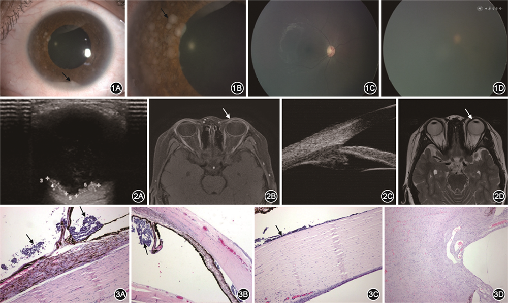 患者女性,8岁。因左眼红伴视力下降4个月余于2019年5月就诊于首都医科大学附属北京同仁医院北京同仁眼科中心。曾在外院就诊并做前房穿刺,房水检测结果提示眼内活动性炎性反应剧烈,外院诊断为左眼葡萄膜炎。患儿系足月顺产,家族中无类似眼内肿瘤病史。眼部检查:右眼视力1.2,左眼视力下降至眼前指数,矫正后不提高;右眼眼压18 mmHg(1 mmHg=0.133 kPa),左眼眼压42 mmHg;双眼眼位正,眼球各向运动未见异常。裂隙灯显微镜检查:左眼眼睑无红肿,结膜充血,角膜水肿,角膜缘可见新生血管,角膜后大量灰白色尘状角膜后沉着物,前房下方可见灰白色絮状及绒球状沉积物,虹膜表面新生血管生成,房水闪光(+++),浮游细胞(++++),虹膜表面附着有大量灰白色团状及绒球状且边界不清的病灶,瞳孔圆,直径4 mm,对光反射消失,晶状体清,前部玻璃体混浊;眼底检查,左眼玻璃内见灰白云雾状团块(图1)。右眼眼前节及眼底检查未见异常(图1)。眼彩色超声检查见左眼玻璃体内大量弱点状回声,颞下方周边球壁可见不规则隆起回声,边界不清(图2)。眼眶MRI检查:增强后见左眼球虹膜睫状体异常增厚强化(图2),眼内未见明显异常强化区。超声生物显微镜检查见左眼前房内可见弱点状回声,全周根部虹膜与角膜回声相贴遮挡巩膜突,虹膜回声变薄,鼻下方虹膜前可见团状中低回声相连(图2),累及房角,全周周边玻璃体内可见团条状回声与球壁相连。全身检查及相关生化检查未见异常。