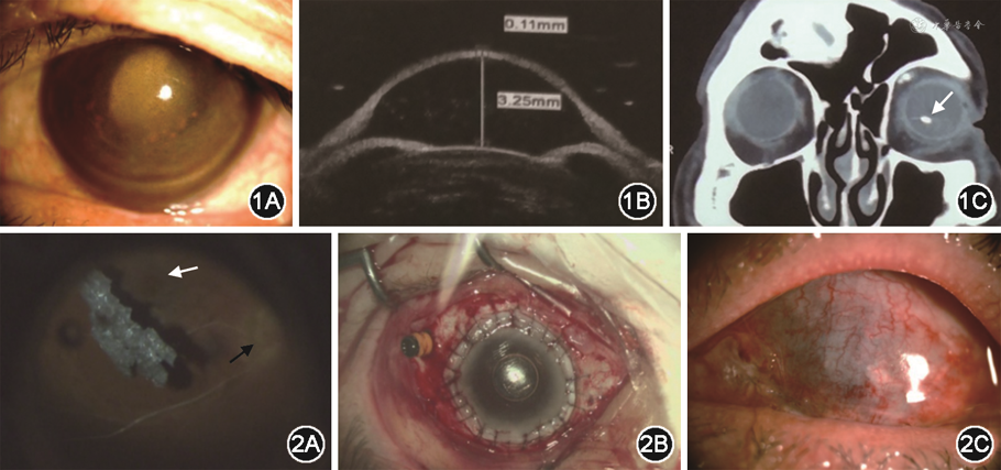 患者男性,58岁。因左眼被铁矿石崩伤后视力下降11个月,于2019年12月就诊于解放军总医院第一医学中心眼科。患者11个月前左眼被铁矿碎屑崩伤后出现眼红、刺痛、流泪。20 d后伤眼视力明显下降伴间断眼痛,根据外院病历记录,主诉为“左眼被石子击伤”。左眼裸眼视力0.4,最佳矫正视力0.7(+1.50 DC×15°),眼压10 mmHg(1 mmHg=0.133 kPa),鼻上方角膜白斑,对应处虹膜脱色素,眼底模糊。视网膜电图:左眼30 Hz闪烁光反应P1波幅降低;a波、b波正常;视觉诱发电位:正常。伤后4个月,左眼裸眼视力降至手动/20 cm,矫正不提高,眼压21 mmHg,角膜透明性差,房水闪光(+)。眼科B超:左眼玻璃体大量点状回声。超声生物显微镜:左眼鼻上方虹膜部分缺如。诊断为左眼外伤性虹膜睫状体炎,抗炎治疗无改善。伤后10个月左眼全角膜灰黄色混浊,菲薄,锥状前突,眼压13 mmHg,眼内结构均窥不见。视网膜电图:左眼a波、b波熄灭;视觉诱发电位:左眼P2波峰潜时明显延迟,波幅显著下降。诊断为左眼角膜血染;左眼继发性圆锥角膜,建议眼球摘除。患者拒绝而转诊至解放军总医院第一医学中心眼科,于门诊自述“左眼被石子击伤”,详问病史得知为铁矿石(赤铁矿)碎屑崩伤。现左眼视物不见伴明显眼痛。既往史、个人史及家族史无特殊。眼部检查:左眼裸眼视力无光感,眼压T+2,左眼结膜轻度混合充血,全角膜菲薄,锥状前突,大量铁锈样物质沉积于角膜基质及内皮面,荧光素染色见角膜上皮散在点染,中央前房深,全周虹膜前粘连,瞳孔直径约5.0 mm,对光反应消失,晶状体黄白色全混,余结构窥不清(图1A)。右眼视力1.0,眼压14 mmHg,前节及眼底未见明显异常。超声生物显微镜显示左眼角膜向前呈钟形膨隆,中央厚度110 μm(图1B)。共聚焦显微镜检查见左眼角膜上皮细胞大小不一、明暗斑驳,未见正常基质细胞及内皮细胞。眼部B超提示异物可能。眼眶CT证实为球内金属异物,大小约5.2 mm×3.3 mm(图1C)。诊断:(1)左眼球内金属异物;(2)左眼继发性圆锥角膜;(3)左眼并发性白内障;(4)左眼继发性青光眼;(5)左眼铁质沉着症。经对症处理,左眼眼压控制在T+1。由于患者拒绝眼球摘除手术,按保留眼球手术计划进行。全身麻醉下行左眼全角膜穿透性角膜移植术、房角分离术、周边虹膜切除术、白内障摘除术、玻璃体切除术、球内异物取出术、硅油填充术和结膜遮盖术。术中剪除全部角膜(直径约10.5 mm)及摘除混浊晶状体后见玻璃体棕褐色点絮状混浊,眼底视盘颜色苍白、边界欠清,黄斑区颜色暗,视网膜菲薄,血管广泛闭塞呈白线状,周边视网膜变性呈大片骨细胞样改变。5∶00方位锯齿缘附近见薄片状不规则灰黑色异物,表面半金属光泽,质地脆,分离异物时其坠入眼底(图2A),异物镊夹出异物后将带巩膜边的全层角膜植片(直径约12.0 mm,刮除全部角膜上皮)间断缝合至植床上(图2B)。玻璃体腔注入硅油,指测眼压Tn;行全结膜遮盖。角膜组织病理学报告:角膜组织厚薄不一,部分上皮缺失,前弹力层消失,基质层纤维组织增生伴玻璃样变性及色素沉着。术后左眼视力无光感,眼压Tn,遮盖的结膜愈合良好(图2C)。