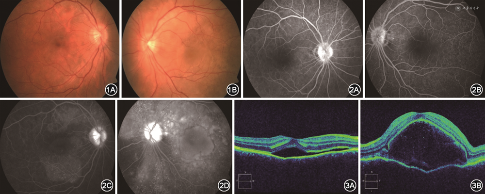 全身检查无听力障碍及皮肤改变。眼部检查:矫正视力右眼为0.3,左眼为0.2;眼压正常;右眼前节无明显异常,左眼前房闪光(+);双眼黄斑区神经上皮脱离,左眼明显,左眼视盘轻度水肿(图1)。荧光素眼底血管造影术(fundus fluorescence angiography,FFA)检查结果显示右眼早期后极部多发点状强荧光,中晚期多发湖状荧光素积存;左眼视盘荧光素渗漏,后极部弥漫针尖样强荧光,晚期呈多湖状荧光素积存(图2)。相干光层析成像术(optical coherence tomography,OCT)检查结果显示双眼黄斑区神经上皮局限性脱离,左眼明显(图3)。初步诊断:双眼福格特-小柳-原田综合征(Vogt-Koyanagi-Harada syndrome,VKH综合征);双眼屈光不正;右腹股沟淋巴结转移性恶性黑色素瘤。治疗:(1)双眼曲安奈德球后注射(双眼各20 mg)。(2)左眼醋酸泼尼松龙滴眼液点眼,每日3次;复方托吡卡胺滴眼液点眼,每日2次。