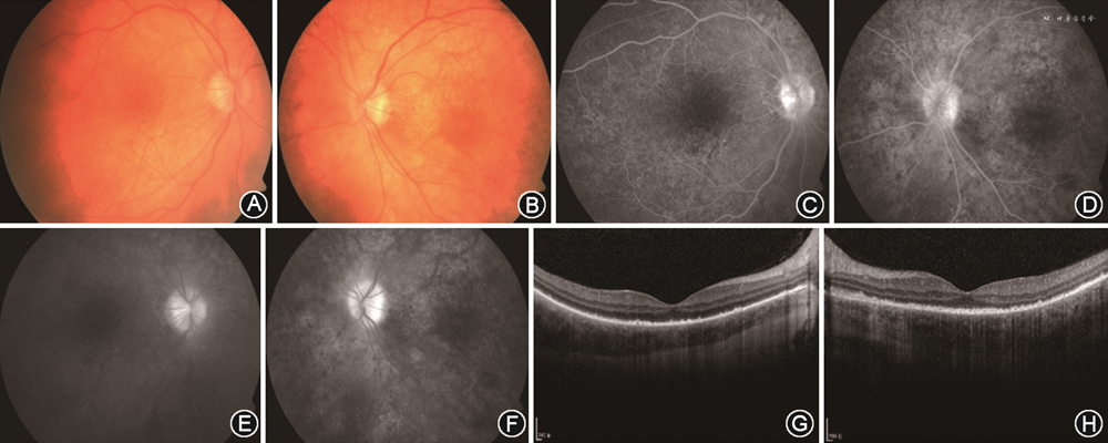 用药1周后复查,因双眼视力、房水闪光及黄斑区神经上皮脱离等症状无明显改善,给予双眼玻璃体腔注射地塞米松缓释剂1次。治疗后1个月双眼视力明显改善,矫正视力右眼为0.9,左眼为0.5;双眼眼压正常;左眼房水闪光消退,双眼视网膜神经上皮脱离完全复位,左眼后极部色素紊乱。根据肿瘤科会诊意见,恢复口服维莫菲尼(480 mg,每日2次)。2个月后双眼视力再次下降,矫正视力右眼为0.8,左眼为0.1;双眼眼压正常;双眼前节正常,右眼眼底无明显异常,左眼后极部神经上皮脱离。左眼球后注射曲安奈德(20 mg)。双眼持续视物模糊,矫正视力右眼为0.5,左眼为0.3;双眼羊脂状角膜后沉着物(++),房水闪光(+),浮游物(+),虹膜局部后粘连,晶状体透明,晚霞样眼底(图4中A和B)。FFA和OCT检查结果均符合VKH综合征晚期表现(图4中C~H)。双眼局部使用醋酸泼尼松龙滴眼液(每日3次)、妥布霉素地塞米松(0.3%妥布霉素,0.1%地塞米松)眼膏(每晚1次)、复方托吡卡胺滴眼液(每日2次)。根据肿瘤科会诊意见,因服用维莫菲尼总时间已近1年,可停止用药。停药后1个月矫正视力右眼为0.8,左眼为0.5;双眼前节炎性反应消退,视网膜神经上皮复位,色素上皮脱色呈晚霞样眼底。