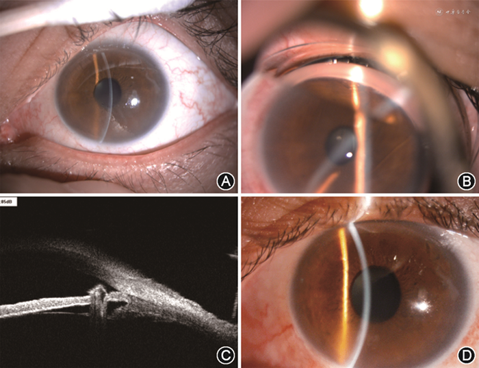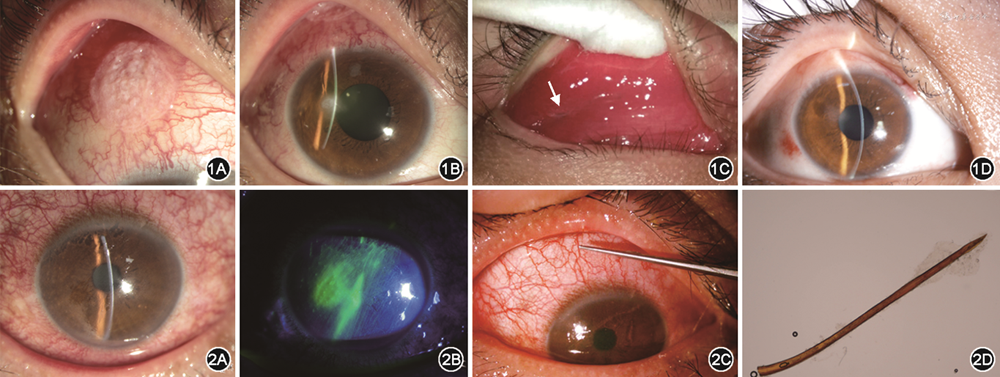 例1 患者女性,26岁。因右眼红、畏光伴睁眼困难5个月,于2017年2月就诊山东省眼科医院角膜病科。1个月前于当地医院行结膜肿物切除术,术后2周肿物复发。眼部检查:右眼裸眼视力0.3,右眼角膜轻水肿,中央偏颞侧见1 mm×1 mm白色溃疡灶,同时颞上方球结膜充血明显,牵拉上睑后可见6 mm×6 mm圆形溃疡灶。仔细检查患者,发现双眼重睑处皮肤瘢痕。追问病史,诉2年前于当地美容院行重睑成形术。翻转右眼上睑后发现上穹隆结膜高度充血水肿,表面麻醉后应用显微平镊进行探查,发现黏膜皱襞内外露长约2 mm蓝色丝线线头及线结。诊断:(1)右眼角膜溃疡;(2)右眼结膜溃疡;(3)双眼重睑术后。球周阻滞麻醉后将穹隆结膜下埋藏的缝线全部拆除,术后1周结膜及角膜溃疡愈合,术后随访半年未见复发(图1)。