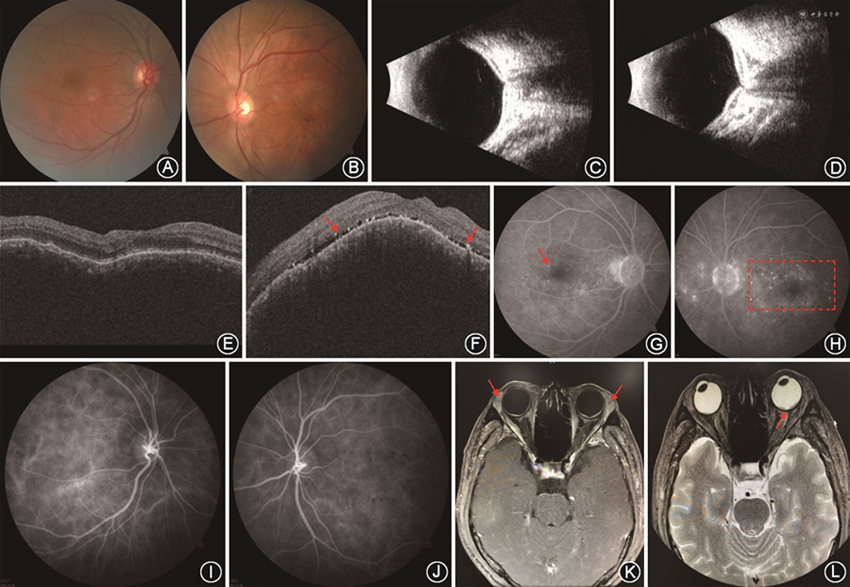 患者男,57岁。因“左眼进行性视物不清伴视物变形1个月”于2021年3月18日至南通大学附属医院眼科就诊。视力右眼0.8,左眼0.4(矫正不能提高),双眼外眼及眼前节检查未见明显异常。眼底照相可见右眼黄斑区局限性隆起伴色素紊乱,黄斑颞侧小片状出血,鼻下小片状灰黄色病灶;左眼黄斑区隆起伴大量色素增殖,后极部见脉络膜皱褶(图1中A,B)。眼部B超可见双眼视网膜浅脱离,后极部视网膜下脉络膜增厚呈低回声,球后不规则低回声病变包绕视神经和球壁,尤以左眼显著(图1中 C,D)。相干光层析成像术(optical coherence tomography,OCT)可见双眼脉络膜增厚隆起,左眼后极部神经上皮层脱离,双眼视网膜色素上皮(retinal pigment epithelial,RPE)可见见多枚点状高反射信号(图1中 E,F)。荧光素眼底血管造影术(fundus fluorescence angiography,FFA)可见造影早期斑驳状背景荧光,后极部见针尖状强荧光,随时间延长,后极部及鼻侧针尖样强荧光增强,同时见点片状弱荧光(图1 中G,H)。吲哚青绿血管造影术(indocyanine green angiography,ICGA)可见右眼后极部及鼻侧见点状弱荧光,左眼后极部点片状弱荧光,双眼斑驳状背景荧光(图1中 I,J)。眼眶MRI示两眼球后壁见弧形异常信号,T1WI呈稍高信号,T2WI呈等信号,左眼明显;两眼泪腺增大,边界清楚,T1WI呈等信号,T2WI呈稍低信号,增强呈均匀、明显强化(图1中 K,L)。