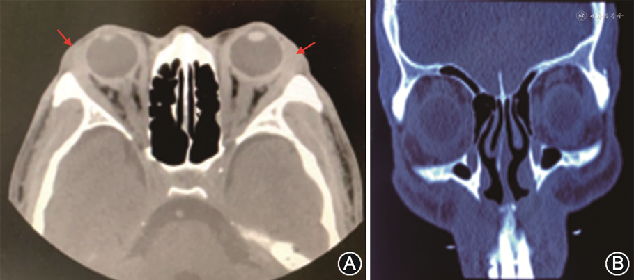 追问病史,患者曾于8个月前因双眼球突出伴眼红、流泪半年至外院眼科就诊。视力右眼为1.0,左眼为0.8,双眼上睑红肿,泪腺区肿胀,双眼球结膜充血水肿,各直肌止端结膜呈紫红色充血肥厚,双眼眼压及眼底未见异常。眼眶CT提示双眼内、外、上、下直肌均见明显增粗,边缘模糊,眶内脂肪间隙模糊,泪腺肿大(图2中A)。外院诊断为双眼眶炎性假瘤,予以地塞米松10 mg静脉滴注1次,后改为醋酸泼尼松80 mg/次、1次/d口服,并逐渐减量。治疗6个月后患者症状好转,复查眼眶CT,可见双眼内外、上下直肌稍增粗,边缘清晰,泪腺肿大较前好转(图2中B)。