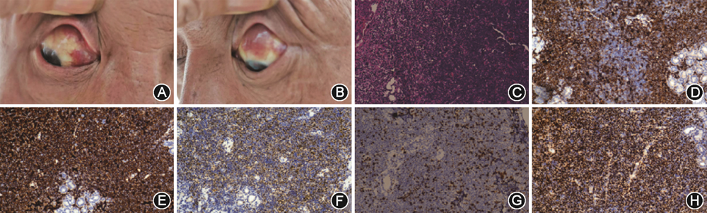 患者此次入院包括肿瘤相关指标在内的全身检查未见明显异常。初步考虑双眼眶炎性假瘤,双眼脉络膜炎(不能排除IgG 4眼病)可能,予以甲泼尼龙80 mg静脉滴注2 d,后改为口服醋酸泼尼松片 100 mg/次、1次/d,后逐渐减量,共治疗2个月。期间患者左眼视力进一步下降,多次复查血浆IgG 4均在参考值范围以内。2021年6月29日患者至复查,右眼视力0.8,左眼视力0.2(矫正不能提高),左眼上睑泪腺区轻度肿胀,触及泪腺肿大,双眼内直肌、上直肌止端球结膜呈紫红色充血隆起(图3 中A,B),双眼眼底仍可见黄斑隆起,色素紊乱。为明确诊断,入院后行左眼泪腺活检,病理检查可见左泪腺组织破坏,淋巴组织呈浸润性生长,细胞体积明显增大,具有明显异型性,核仁明显,染色质较粗,免疫组织化学检查结果示CD5(+),CD20(+),CyclinD1(2+),SOX11(+++),Ki67(15%)(图3中 C~H),诊断为套细胞淋巴瘤。全身淋巴结检查未见明显异常肿大淋巴结,头颅MRI和正电子发射CT(positron emission tomography-CT,PET-CT)检查未见全身其他部位肿物。诊断为双眼原发性眼附属器套细胞淋巴瘤眼内浸润。