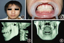 保守治疗3年后:①面形不对称,颏部向左偏斜,咬合关系正常,中线无偏斜,张口度35 mm,开口型略向患侧偏斜,下颌前伸和侧向运动正常,颞下颌关节区无疼痛及弹响;②CT可见患侧髁突畸形愈合,分叉缩小至髁头上1/3处。左侧颏孔区骨折线消失。双侧下颌支高度未见明显异常(图3,图4,图5,图6)。