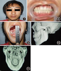 像保守治疗5年后:①面形不对称,颏部略向左偏,咬合关系正常,中线无偏斜,张口度40 mm,开口型无偏斜,下颌前伸和侧向运动正常,颞下颌关节区无疼痛及弹响;②CT可见患侧髁突畸形愈合,髁头分叉缩至髁突上端,外形接近正常髁突,双侧下颌支高度未见明显异常(图7,图8,图9,图10,图11)。