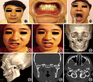 保守治疗13年后:①面形轻度不对称,颏部略向左偏,咬合关系正常,中线无偏斜,张口度40 mm,开口型无偏斜,下颌前伸和侧向运动正常,颞下颌关节区无疼痛及弹响;②CT可见患侧髁突形态接近正常,髁突前外侧有新生骨,累似骨赘。患侧关节间隙存在。双侧下颌支高度未见明显异常(图17,图18,图19,图20,图21,图22,图23,图24,图25)。