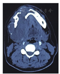 近中颊侧,向后至下颌升支部,表面无破溃,皮温无升高。肿物质地硬,边界不清,有压痛,有乒乓感。无下唇麻木及张口受限,双侧头颈部未扪及明显肿大淋巴结。口内黏膜表面完整、无破溃。