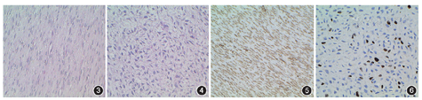 术后病理:送检物为切除之下颌骨双侧骨体及肿物,约11.0 cm×8.0 cm×4.5 cm大小,骨质颊侧膨隆,肿物表面大部光滑似有包膜,呈结节状,切面灰白,实性,质地中等,骨腔内完全为肿物占据,骨皮质菲薄(图2)。镜下可见肿瘤主要由产生胶原纤维的成纤维细胞构成,成纤维细胞及胶原纤维束呈波浪状交织(图3),部分区域细胞生长较活跃(图4),细胞轻度异型,偶见核分裂,瘤组织呈浸润性生长,免疫组化波形蛋白(+)(图5)、平滑肌肌动蛋白(-)、肌动蛋白(-)、β-联蛋白(-)、S-100(-)、细胞角蛋白(-)、CD68(-)、部分区域Ki-67呈阳性表达,表达率<10%(图6)。病理诊断:促结缔组织增生性纤维瘤。