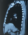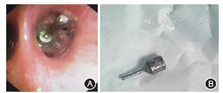 男性患者,55岁,因上颌后牙拔除后3个月,要求种植修复于2017年3月济南军区总医院口腔科就诊。口内检查情况为26、27缺失,拟在26、27位点植入两枚4.8 mm×10.0 mm种植体。手术开始后,患者咽反射明显,不停要求吸出口内分泌物,吸引器吸引时又出现恶心咳嗽,立即停止手术,与患者沟通后认为患者尚可耐受手术,休息后患者状态良好,采取改变椅位角度、在咽部放置纱布等措施进行保护,旋入27种植体愈合基台时纱布影响操作,遂取出纱布在旋紧27种植体愈合基台完成后,患者突然剧烈咳嗽闭合口唇,螺丝刀掉落口内并被吞入。放平患者后进行椅旁X线照射,示螺丝刀位于主支气管内,患者咳嗽但无呼吸不畅。胸部CT可见螺丝刀位于右侧主支气管内(图1,图2),六方刀口朝上,利于纤维支气管镜取出。呼吸内科医师在充分麻醉下,使用电子纤维支气管镜异物夹持器械(软管)取出异物(图3)。患者无咳嗽,常规口服三日抗生素(阿莫西林、甲硝唑)预防肺部感染。