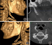 (1)临床资料:患者男性,38岁,因"下颌右侧第一磨牙疼痛2天"于2018年11月14日就诊于郑州大学第一附属医院口腔科门诊。经曲面体层X线片检查,发现下颌骨右侧多生骨两块(图1)。查体:患者一般状况较好,面部对称,双侧下颌角无红肿,无压痛,咽部黏膜正常,无张口受限,颈部活动无受限,右侧颈部下颌骨下方触及长条形硬物,质地坚硬,按压无痛感。患者自述夜间睡眠时张口呼吸,打鼾较重,但无呼吸暂停,无其他自觉症状。锥形束CT(Kavo 3D Exam,美国)检查显示,右侧茎突舌骨韧带可见明显分节的三段骨(图2),第一段骨长21.26 mm,与颞骨下关节窝形成关节(图3),第二段骨长39.79 mm,与第三段骨形成关节,第三段骨长28.16 mm,与舌骨体相距4.78 mm,未见右侧舌骨小角。左侧茎突舌骨韧带可见两段骨(图4),第一段与颞骨相连,是1块长53.74 mm的巨大茎突,第二段骨长12.97 mm,与茎突相距29.33 mm,与左侧舌骨小角相距2.36 mm。患者左侧舌骨大角向内侧弯曲(图5),两舌骨大角游离端内缘之间距离(设为a线)为31.55 mm,舌骨体内缘至a线的距离为28.71 mm,颈椎椎体前缘至a线的距离为3.51 mm。两舌骨大角游离端与第四颈椎之间各有一块直径约4 mm大小的类圆形小骨(图5),左侧小骨距左侧舌骨大角1.46 mm,距第四颈椎体中部外侧缘4.07 mm,右侧小骨距右侧舌骨大角1.00 mm,距第四颈椎右侧横突(横突孔位置)前缘3.75 mm。