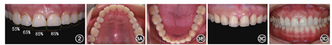 (1)美学重建设计:上前牙通过加长切缘恢复理想的长宽比和与上唇协调的切缘连线,22龈缘位置偏高,通过调整22切缘位置达到视觉上与邻牙协调(图2);下前牙通过修复方式改善扭转,改善融合牙形态。
