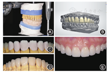 架上;B:数字化扫描复制临时冠形态,颊侧及切端回切设计瓷冠基底;C:颊侧堆加饰瓷;D:瓷冠和临时冠在同一模型上比对,准确复制颊侧表面形态;E:上颌前牙修复完成,完全复制临时冠形态及咬合关系