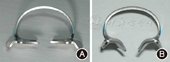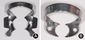 用于固定套在牙上的橡皮布。由弓和夹臂构成(图4A),两夹臂由拱起的弓连接。夹臂向外伸展的两个部分为翼,较窄的为前翼,较宽的为中央翼,用以撑开隔离牙邻近的软组织,更好地暴露术区;也有无翼的橡皮障夹(图4B),安装方法不同于有翼的夹子。夹臂上的孔用以安放橡皮障夹钳。两夹臂内侧的边称为喙,是卡抱牙颈部的主要部位。喙上有尖角用于固位。喙的角度、长短及尖角数目有所不同,通常用的夹子是水平喙(图5A)。但当患牙临床冠较短或为残冠、残根时,水平喙夹子不能夹住牙齿,这种情况可选用弯曲喙夹子(图5B),它可根向伸入龈缘下夹住牙面。还有锯齿样喙、两臂喙长不一致的夹子,用于隔离牙不规则情况时增强对牙面的贴合度和固位。